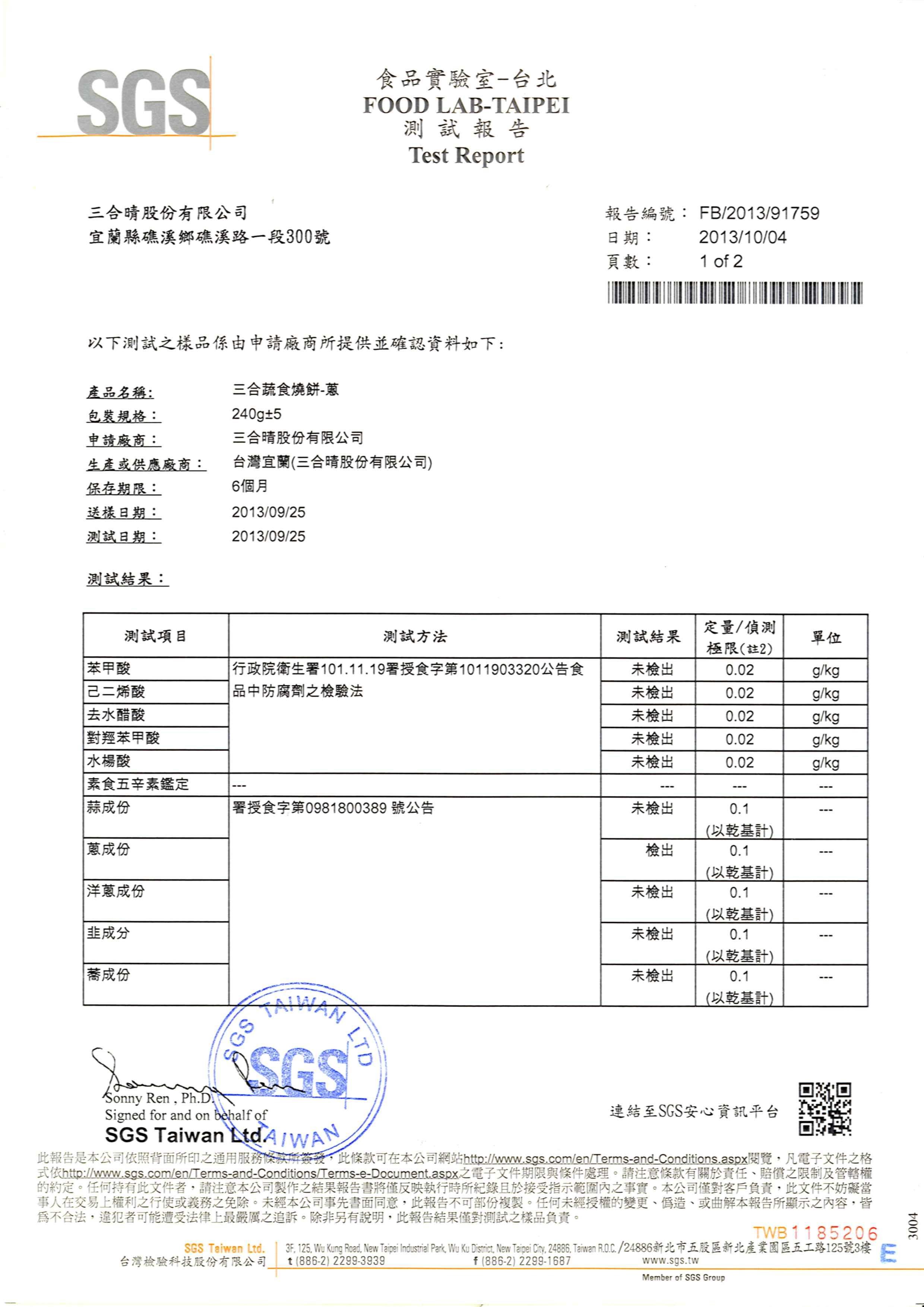 三合蔬食燒餅 蔥燒餅 SGS 檢驗報告