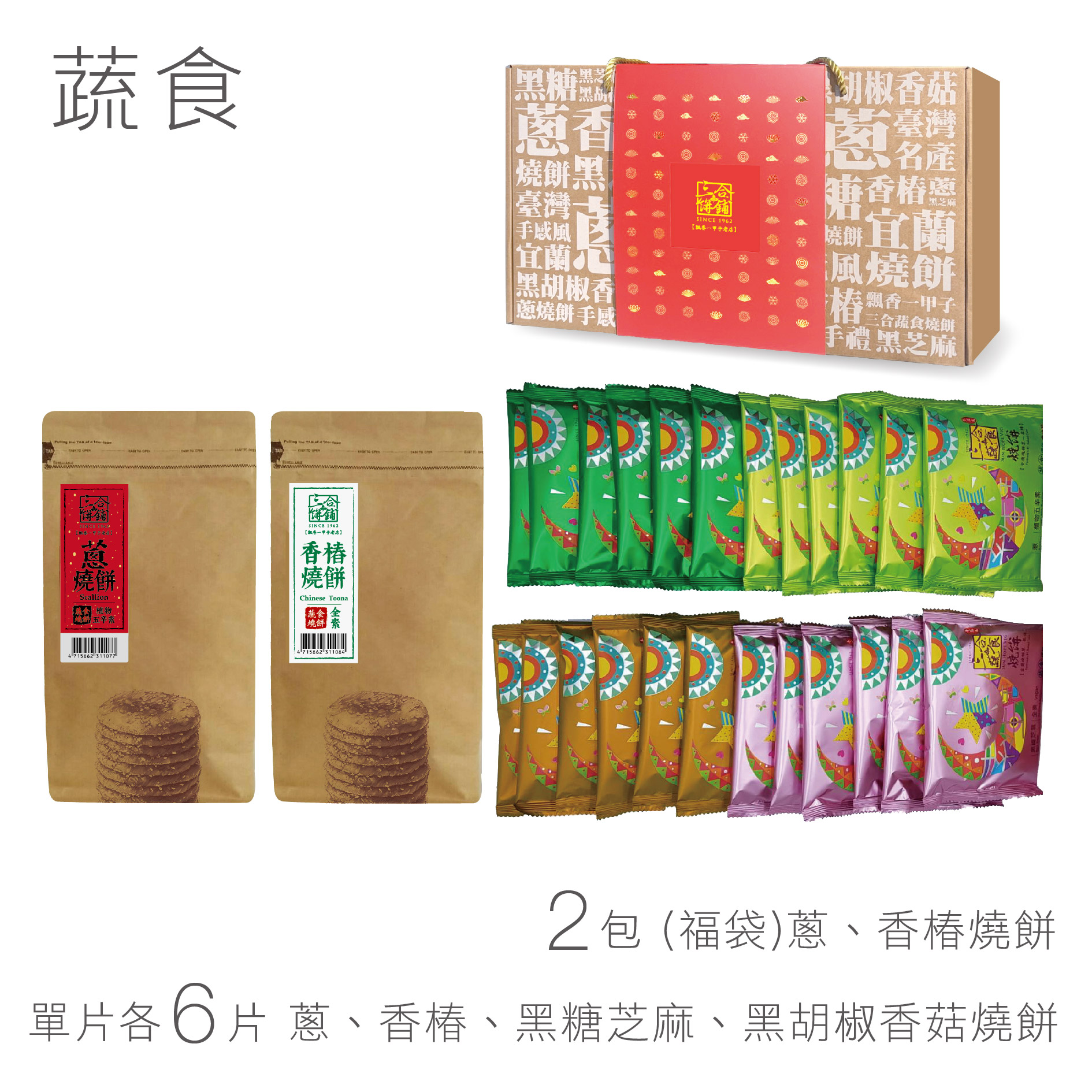 蔥 6 片、香椿 6 片、黑糖 6 片、黑胡椒香菇 6 片